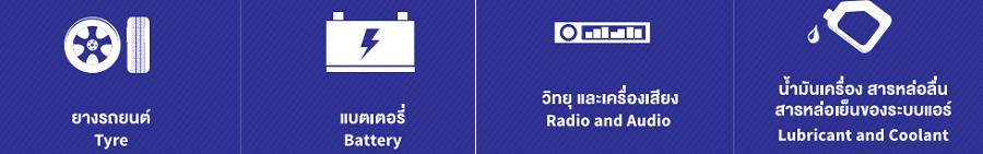 3. ฟรี แอกซ่า ฟอร์ ยู จ่าย 100% เต็ม กรณีอุบัติเหตุสำหรับยาง แบตเตอรี่ (ยกเว้นระบบไฮบริด) สารหล่อลื่น สารหล่อเย็นและวิทยุที่ติดตั้งมาจากโรงงาน