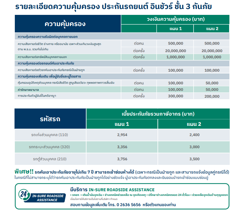 | เงื่อนไขการรับประกันภัย : 1. รับเฉพาะรถเก๋งส่วนบุคคล (กลุ่ม 1-5) รถกระบะปิคอัพ (นํ้าหนักไม่เกิน 3 ตัน) และรถโดยสารส่วนบุคคลเท่านั้น 2. รับประกันรถที่มีอายุไม่เกิน 25 ปี 3. ความคุ้มครองเพิ่มเพื่อผู้ขับขี่และผู้โดยสาร รถเก๋ง = 5 คน , รถกระบะ = 3 คน , รถตู้ = 7 คน 4. ลักษณะการใช้รถส่วนบุคคลเท่านั้น ไม่ใช่รับจ้าง หรือให้เช่า 5. ประเภทรถยนต์ที่ไม่รับประกันภัย ได้แก่ รถที่ติดตั้งโครงเหล็ก/โครงหลังคา รถ Supercar รถแข่ง รถแต่ง รถโหลดเตี้ย ยกสูง รถดัดแปลงสภาพ รถไฟฟ้ า (EV) รถติดไซเรนทุกชนิด รถที่ใช้ในการ Demo หรือ Test drive ทุกกรณี 6. อัตราเบี้ยประกันภัยรวมส่วนลดกล้อง CCTV เรียบร้อยแล้ว |
