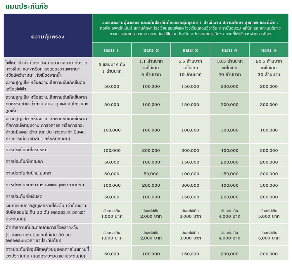 คุ้มครองครอบคลุม คุ้มครองครอบคลุม ภัยจากไฟไหม้ ฟ้าผ่า ภัยระเบิด ภัยอากาศยาน ภัยจากการเฉี่ยวชนของยานพาหนะ ภัยเนื่องจากน้ำ |