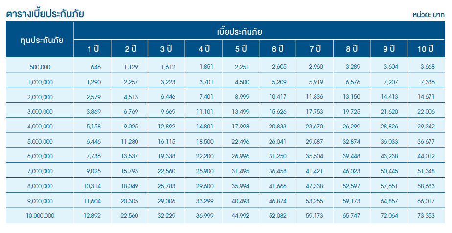 - จ่ายน้อย เบี้ยประกันภัยเริ่มต้นเพียง 646 บาท คุ้มครองมาก ทุนประกันภัยสูงสุด 30,000,000 บาท