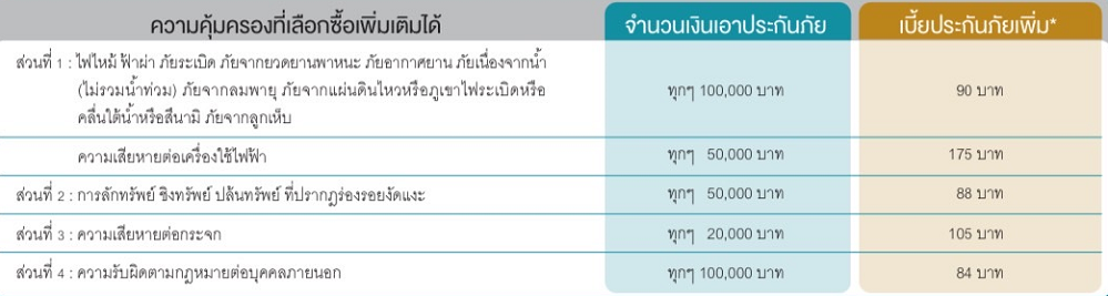 | ความคุ้มครองหลักแผนประกันภัยคอนโด สบาย (Condo Sabai) 1.การประกันอัคคีภัย คุ้มครองทรัพย์สินประกันภัย อันเนื่องมาจาก ไฟไหม้ ฟ้าผ่า (รวมถึงความเสียหายต่อเครื่องใช้ไฟฟ้าและอุปกรณ์ไฟฟ้าที่เกิดจากการลัดวงจรจากฟ้าผ่า) การระเบิด ภัยจากการเฉี่ยว หรือการชนของยวดยานพาหนะ อากาศยาน และภัยเนื่องจากน้ำ (ไม่รวมน้ำท่วม) 2.ขยายภัยเพิ่มพิเศษ ดังนี้ ภัยลมพายุ ภัยแผ่นดินไหว ภูเขาไฟระเบิด คลื่นใต้ น้ำหรือสึนามิ ภัยลูกเห็บ ภัยต่อเครื่องใช้ไฟฟ้า 3.ความคุ้มครองเพิ่มเติม ช่วยลดความกังวลใจของคุณในเรื่องต่างๆ ต่อไปนี้ ค่าใช้จ่ายหรือค่าเช่าที่พักอาศัยชั่วคราว ค่าใช้จ่ายที่จําเป็นเพื่อการดับเพลิง ค่าใช้จ่ายที่จําเป็นสําหรับการคํ้ายัน การรอถอน การทําลาย หรือการขนย้ายซากทรัพย์สินการรื้อถอน การทําลาย หรือการขนย้ายซากทรัพย์สิน ค่าวิชาชีพ (ค่าสถาปนิก พนักงานสํารวจ วิศวกรที่ปรึกษา) 4.การประกันภัยโจรกรรม คุ้มครองความเสียหาย ต่อทรัพย์สินภายในบ้านหรือที่พักอาศัย อันเนื่องจากการโจรกรรมที่ปรากฎร่องรอยงัดแงะ (จร.2) การชิงทรัพย์ การปล้นทรัพย์ รวมถึงค่าซ่อมแซมประตู-หน้าต่าง ค่าใช้จ่ายในการเปลี่ยนอุปกรณ์ล็อกและกุญแจ (เนื่องจากการโจรกรรม) 5.การประกันภัยความรับผิดต่อบุคคลภายนอก คุ้มครองความรับผิดตามกฎหมายที่เกิดขึ้นโดยอุบัติเหตุภายในสถานที่เอาประกันภัยหรือเกิดจากการใช้สถานที่ที่เอาประกันภัยต่อการบาดเจ็บ เสียชีวิต และทรัพย์สินของบุคคลภายนอก 6.การประกันภัยกระจก คุ้มครองความเสียหายของกระจกรวมทั้งกรอบ และสิ่งตกแต่งบนกระจกที่เสียหาย เนื่องจากสาเหตุภายนอก ความคุ้มครองที่เลือกซื้อเพิ่มเติมได้ เพื่อตอบสนองความต้องการที่แตกต่างกัน คุ้มภัยโตเกียวมารีนประกันภัย จึงได้เพิ่มความคุ้มครองพิเศษ ให้ท่านสามารถเลือกซื้อเพิ่มตามวงเงิน และความเสี่ยงภัยที่ท่านต้องการ ตามตารางความคุ้มครองที่เลือกซื้อเพิ่มเติมได้ | |