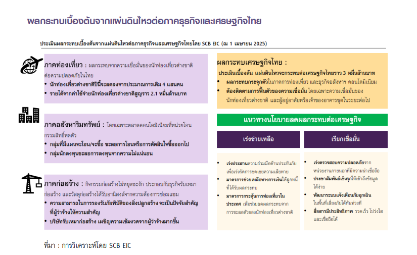 | SCB EIC ประเมิน (ณ 1 เมษายน 2025) แผ่นดินไหวที่เกิดขึ้นในวันที่ 28 มีนาคม 2025 มีผลกระทบเบื้องต้นต่อเศรษฐกิจไทยจำกัดประมาณ 3 หมื่นล้านบาทโดยผลกระทบ จะกระจุกตัวอยู่ในภาคการท่องเที่ยว ธุรกิจอสังหาริมทรัพย์ และธุรกิจก่อสร้าง แต่ยังต้องติดตามการฟื้นความเชื่อมั่นของประชาชนและความเชื่อมั่นของนักท่องเที่ยวต่างชาติในระยะต่อไป |